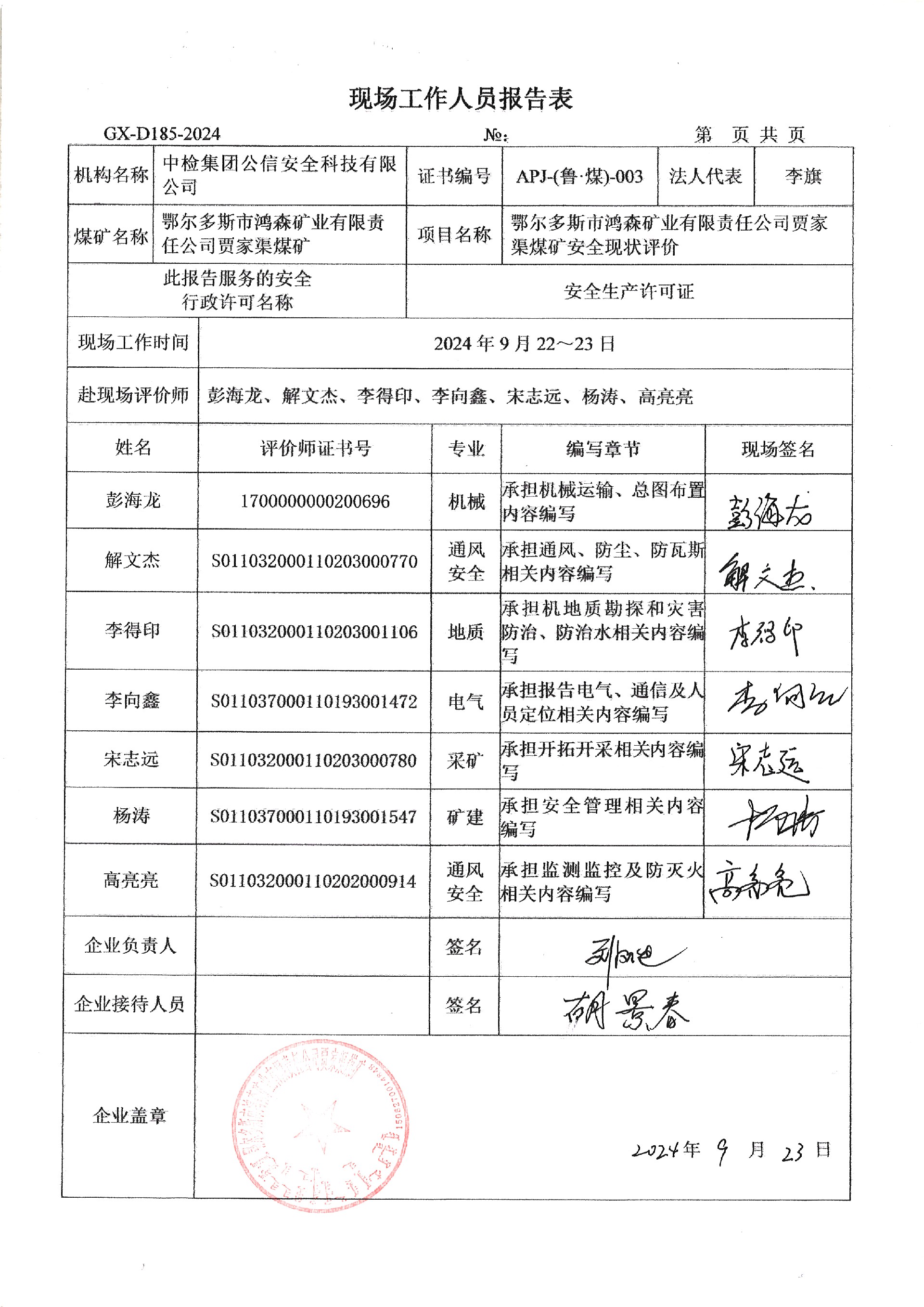 現(xiàn)場(chǎng)開展安全評(píng)價(jià)工作的人員、時(shí)間及主要任務(wù): 彭海龍 李得印 解文杰 李向鑫 宋志遠(yuǎn) 高亮亮 楊濤 于2024年9月22~23日到現(xiàn)場(chǎng)進(jìn)行調(diào)查、搜集資料,進(jìn)行現(xiàn)場(chǎng)評(píng)價(jià)。 于2024年11月5日到現(xiàn)場(chǎng)評(píng)價(jià)時(shí)存在的問題進(jìn)行了復(fù)查。 | |||||||