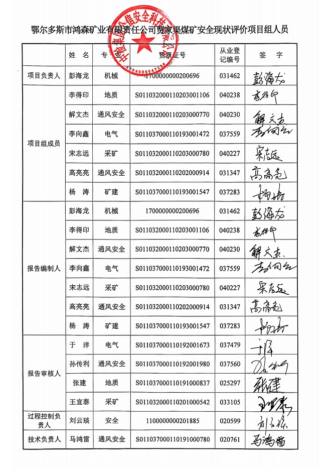 參與安全評(píng)價(jià)工作的安全評(píng)價(jià)師: 彭海龍 李得印 解文杰 李向鑫 宋志遠(yuǎn) 高亮亮 楊濤 | |||||||
