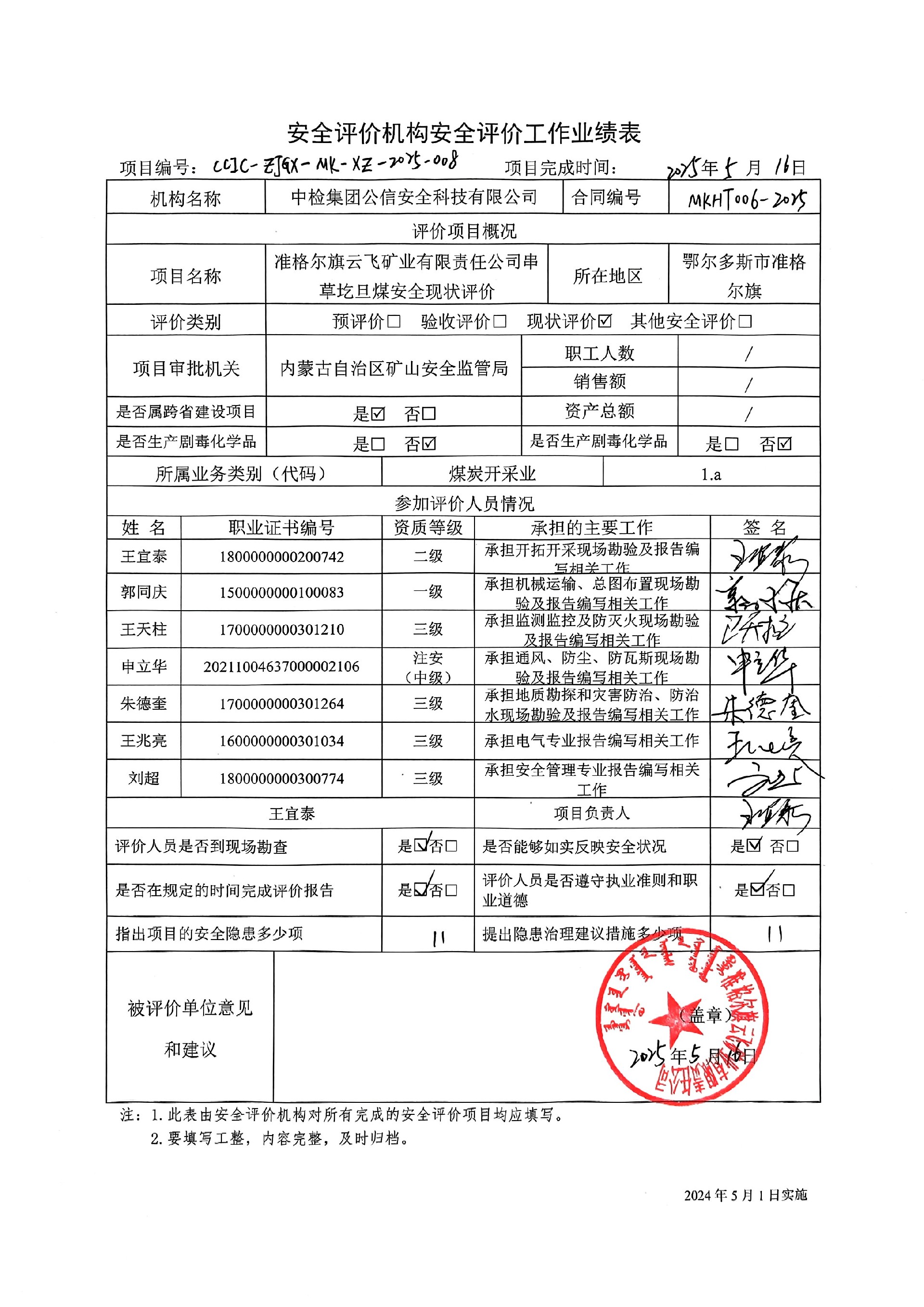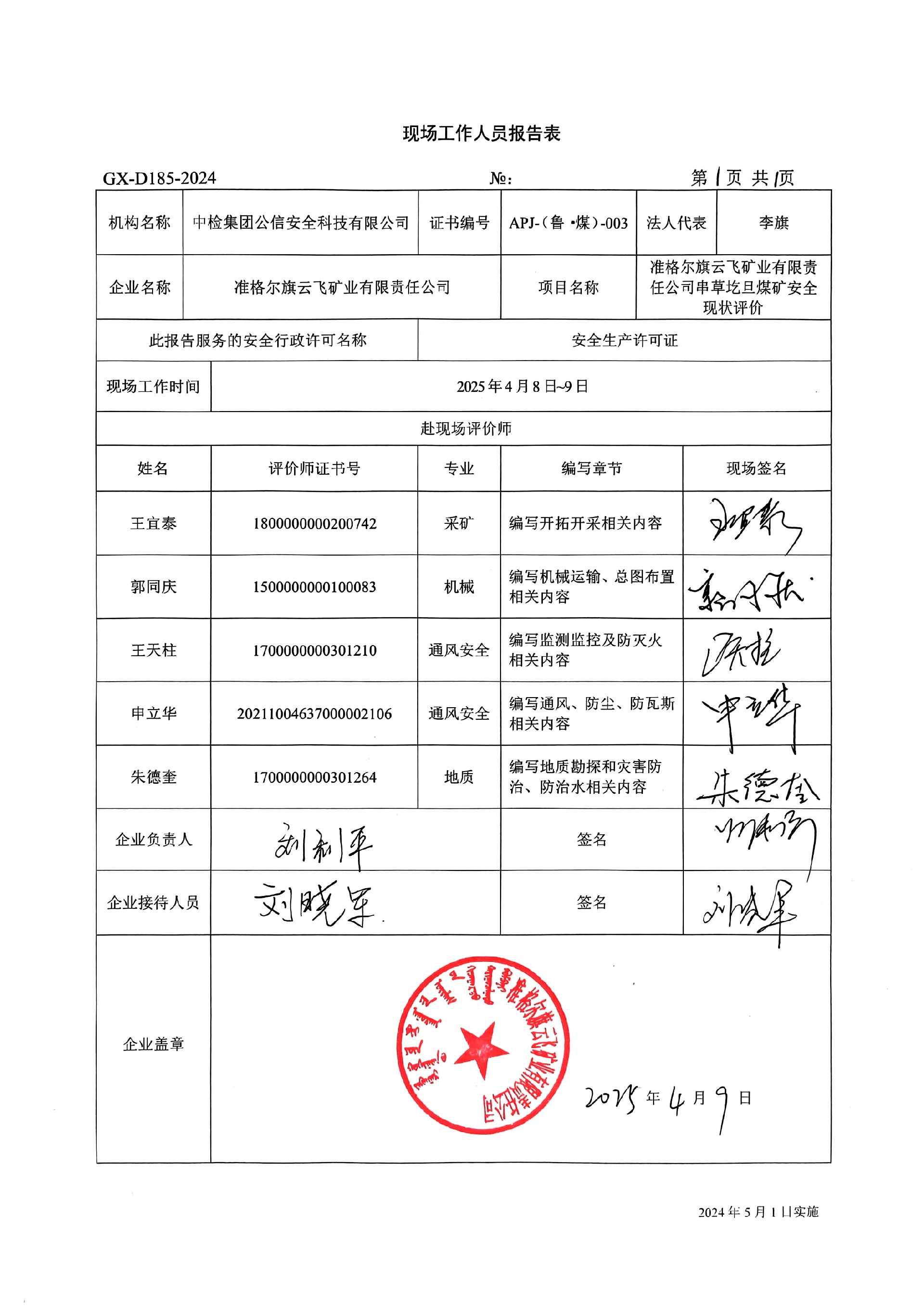 到現(xiàn)場開展安全評價工作的人員、時間及主要任務(wù): 人員:王宜泰、郭同慶、王天柱、朱德奎、申立華 時間、任務(wù): 評價項目組于2025年4月8日~9日到現(xiàn)場調(diào)查、檢查;2025年4月15日編寫修改完善報告。 | ||||||
