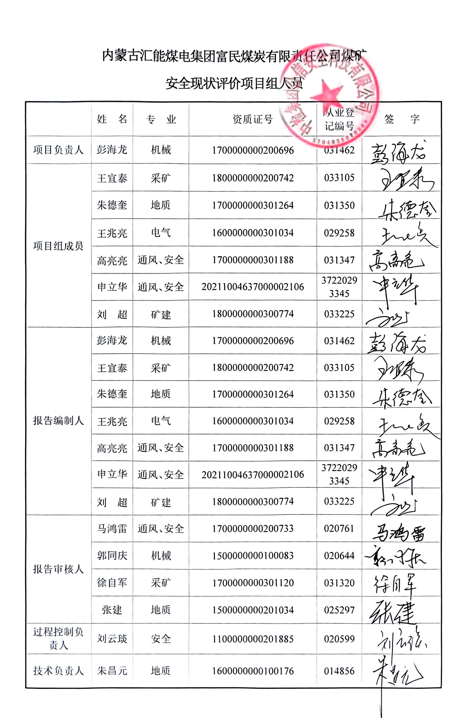 參與安全評(píng)價(jià)工作的注冊(cè)安全工程師: 彭海龍 高亮亮 申立華 朱德奎 王宜泰 | |||||||