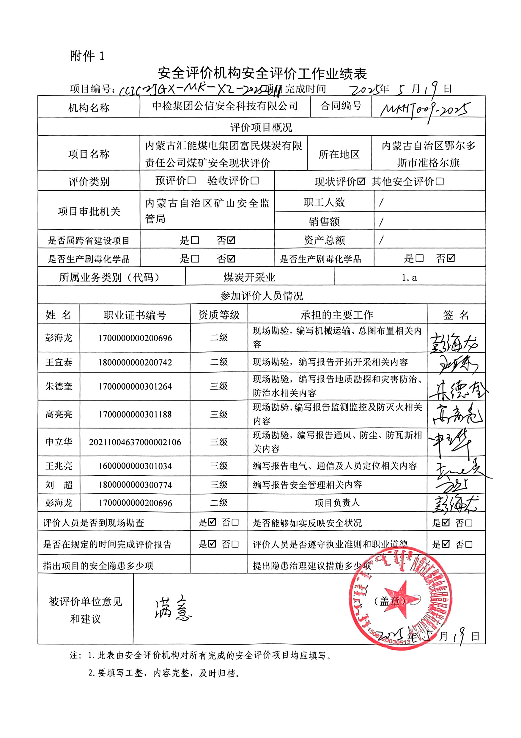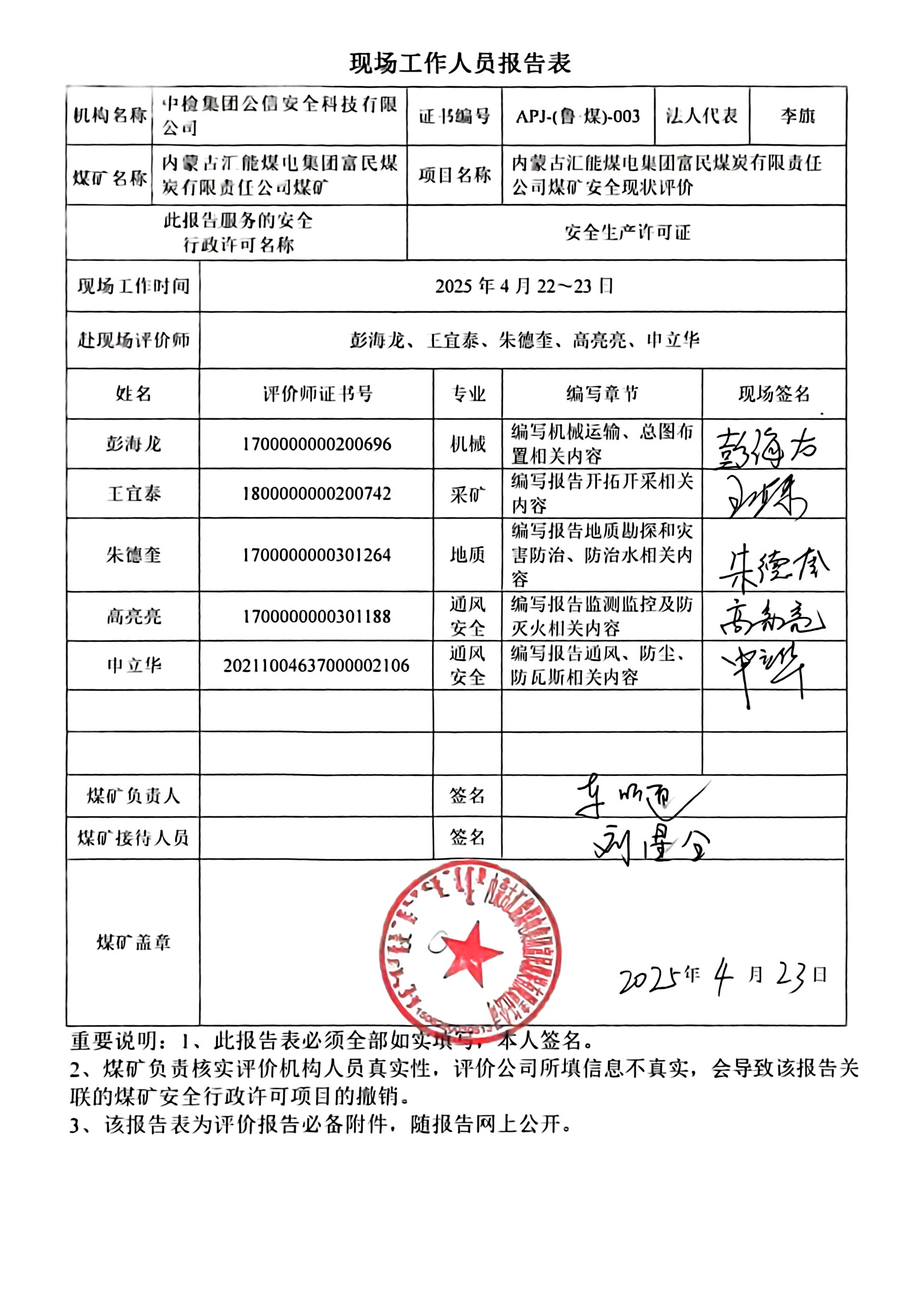 現(xiàn)場(chǎng)開展安全評(píng)價(jià)工作的人員、時(shí)間及主要任務(wù): 彭海龍 高亮亮 申立華 朱德奎 王宜泰于2025年4月22~23日到現(xiàn)場(chǎng)進(jìn)行調(diào)查、搜集資料,進(jìn)行現(xiàn)場(chǎng)評(píng)價(jià)。 彭海龍 申立華于2025年4月25日對(duì)現(xiàn)場(chǎng)問題進(jìn)行復(fù)查,礦方均已整改合格。 彭海龍 高亮亮 申立華 朱德奎 王宜泰 王兆亮 劉超 對(duì)報(bào)告進(jìn)行了編寫。 | |||||||