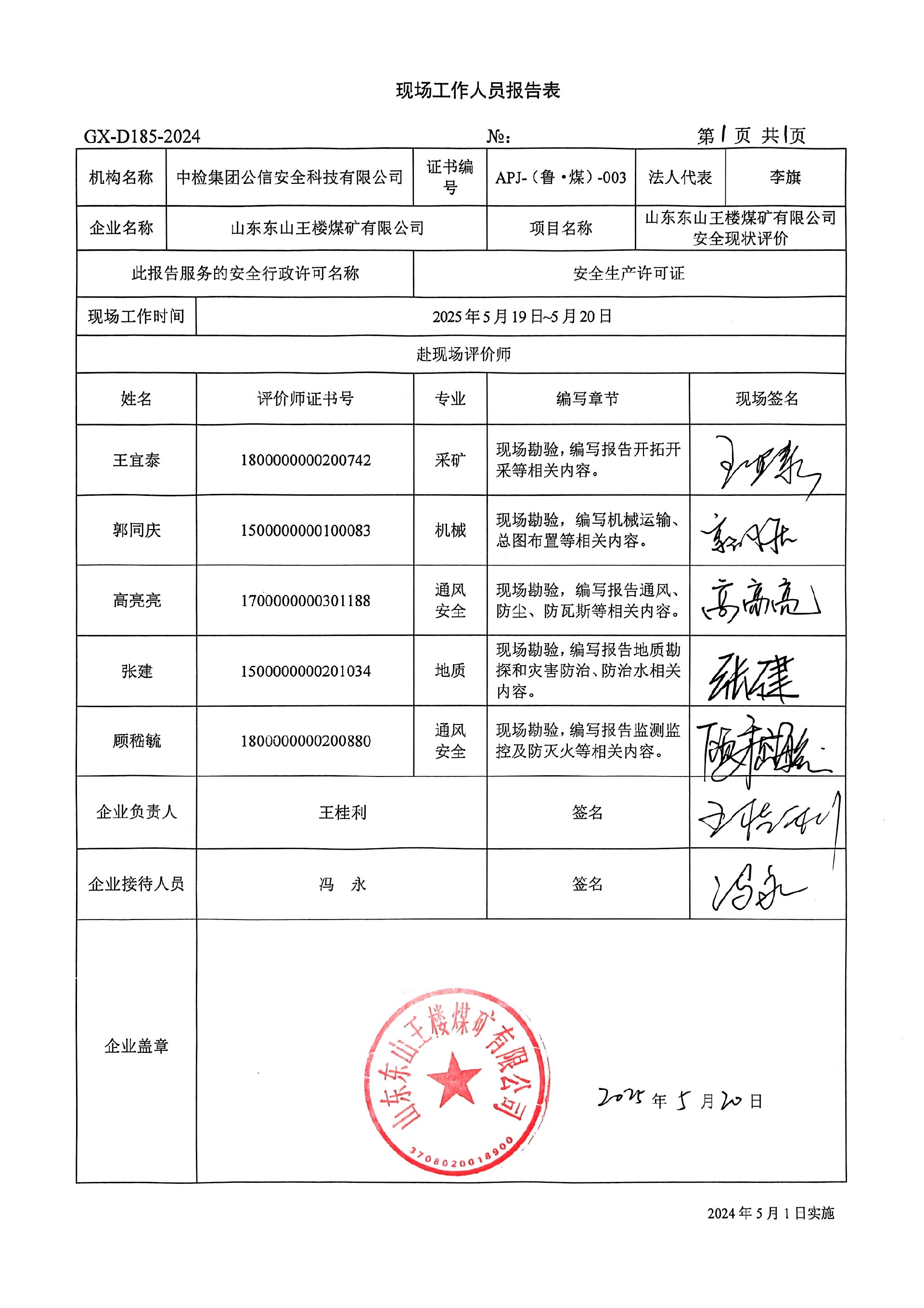 到現(xiàn)場(chǎng)開(kāi)展安全評(píng)價(jià)工作的人員、時(shí)間及主要任務(wù): 人員:王宜泰、郭同慶、高亮亮、顧嵇毓、張建 時(shí)間、任務(wù): 評(píng)價(jià)項(xiàng)目組于2025年5月19日~20日到現(xiàn)場(chǎng)調(diào)查、檢查;2025年5月22日編寫(xiě)修改完善報(bào)告。 | ||||||