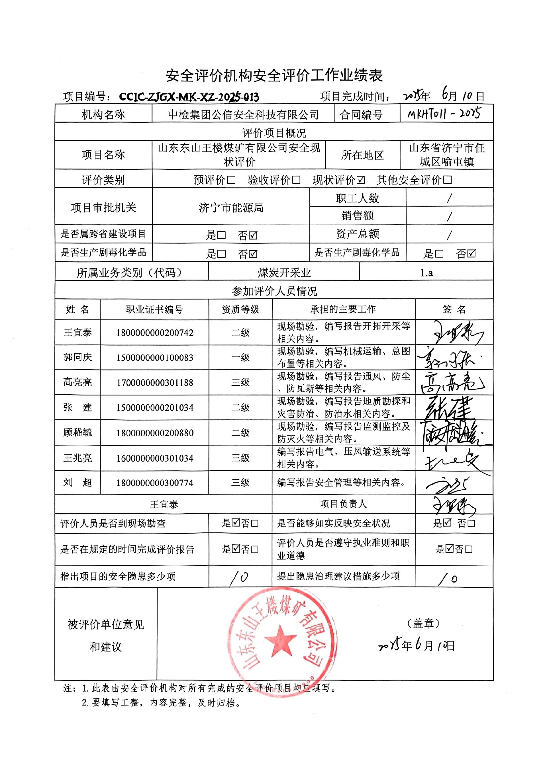 評(píng)價(jià)項(xiàng)目名稱 | 山東東山王樓煤礦有限公司安全現(xiàn)狀評(píng)價(jià)報(bào)告 | |||||