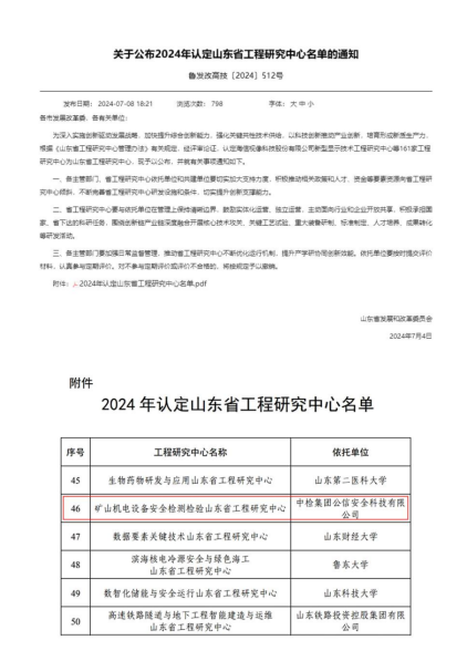 2024年7月4日,山東省發(fā)展和改革委員會公布了2024年認(rèn)定山東省工程研究中心名單的通知,依托中檢集團(tuán)公信安全科技有限公司申報(bào)的“礦山機(jī)電安全檢測檢驗(yàn)山東省工程研究中心”位列其中。山東省工···