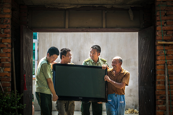 官兵為外來(lái)務(wù)工人員搬來(lái)電視機(jī)
