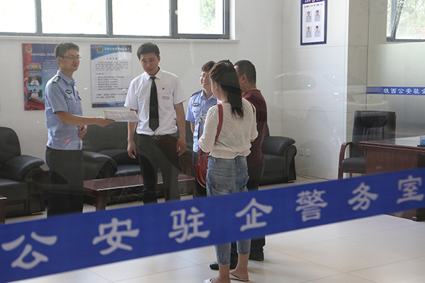 駐企警務(wù)室民警在現(xiàn)場(chǎng)發(fā)放和講解《關(guān)于改進(jìn)和規(guī)范公安派出所出具證明工作的意見(jiàn)》新規(guī)定
