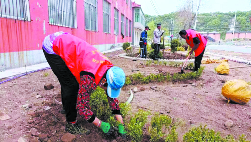 網(wǎng)格員和村民在整理綠化帶。