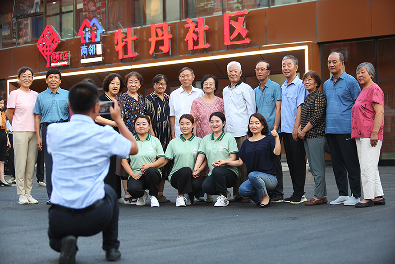 8月17日傍晚,牡丹社區(qū)居民紛紛來(lái)到社區(qū)前合影留念,回味習(xí)近平總書(shū)記來(lái)訪的美好時(shí)刻。記者??蔡冰??攝