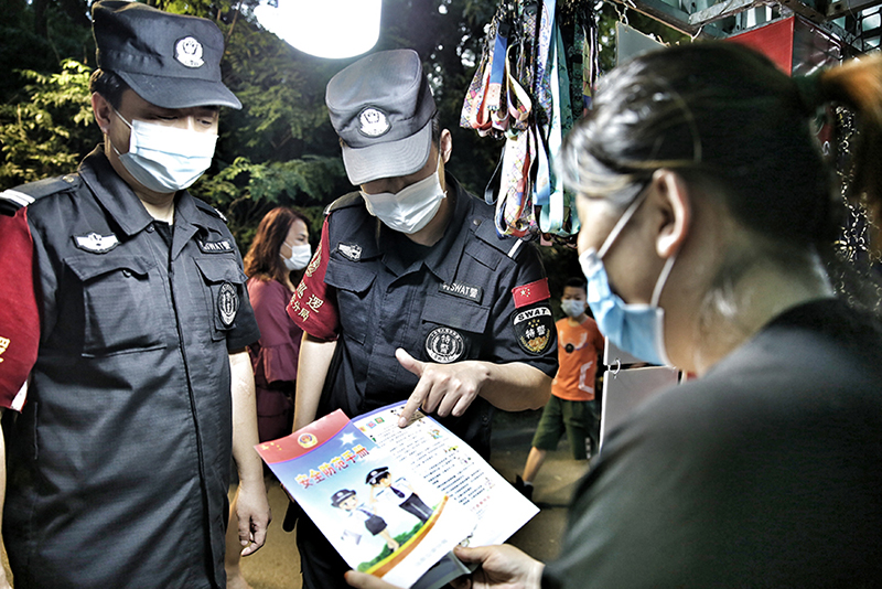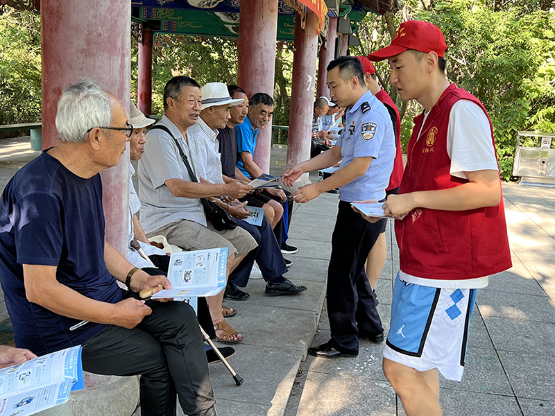 遼陽志愿者和民警一起到公園進行宣傳。
