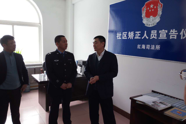 \\閆叢軍(中)向營口市司法局局長王進(右)匯報社區(qū)矯正工作