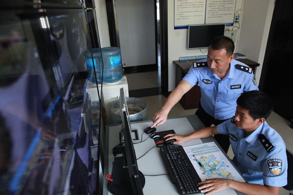 9月18日,鐵嶺縣公安局李千戶派出所所長(zhǎng)李雨(左)和同事在派出所進(jìn)行視頻巡邏