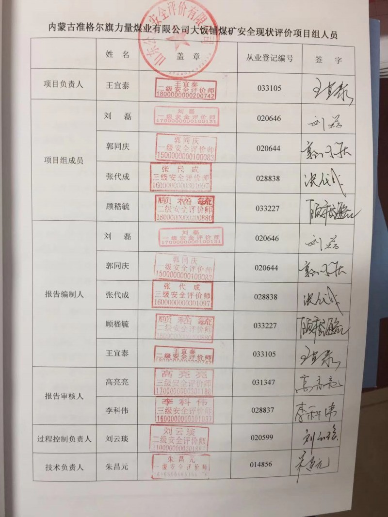| 參與安全評價工作的安全評價師: 王宜泰、劉磊、郭同慶、顧嵇毓、張代成 |