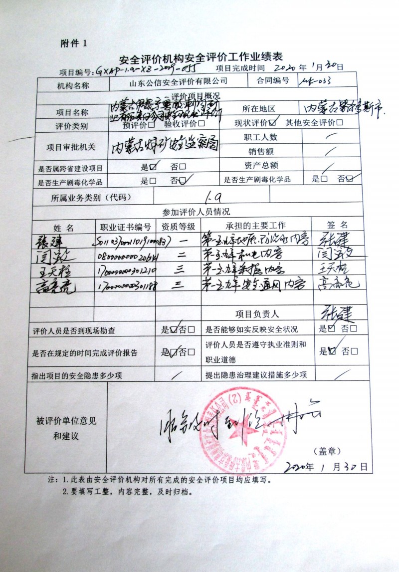 | 參與安全評價工作的安全評價師: 張建、閆運文、王天柱、高亮亮 |